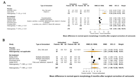 Forest plot of mean difference in normal sperm morphology at 3 months (A) and 6 months (B) after treatment with antioxidants versus placebo or no treatment in patients with surgical correction of varicocele. CI: confidence interval; IV: inverse variance; MD: mean difference; REM: random effects model; SD: standard deviation; WMD: weighted mean difference.