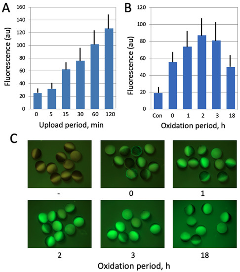In the present study, a cell-permeant compound 2′,7′-dichlorofluorescein diacetate (DCFDA) was employed to evaluate intracellular ROS contents in Xenopus oocytes and eggs. DCFDA is a fluorogenic indicator that measures hydroxyl, peroxyl and other ROS compounds within cells. After diffusion into a cell, the drug is deacetylated by cellular esterases to a non-fluorescent product, which is further oxidized by ROS into a highly fluorescent 2′,7′-dichlorofluorescein (DCF). DCF fluorescence is detected by fluorescent microscopy at 495/529 nm excitation/emission wavelengths. Initially, the protocol for ROS detection with DCFDA was optimized to gain a stronger fluorescent signal. The durations of drug upload and intracellular oxidation were varied, as presented in Figure 2, and the optimal periods of incubation were determined to be 1 h and 2 h for each procedure, respectively. A final concentration of DCFDA in the incubation media was 20 μM. The fluorescent images of oocytes and eggs were taken with the optical interference filters for detection of GFP fluorescence at Ex = 460–495 nm and Em > 510 nm, and the fluorescent signal was quantified using the image acquisition/processing software, as described above in the Section 2.3. The fluorescence from the non-pigmented vegetal hemisphere of oocytes and eggs was quantified.