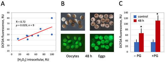 In this study, the fluorescent cell-permeable indicator DCFDA was used for detection of intracellular ROS in frog oocytes and eggs. The protocol for ROS detection with DCFDA was optimized in the context of this study (Figure 2) to gain a stronger fluorescent signal. The durations of drug upload and intracellular oxidation were determined to be 1 h and 2 h, respectively. Next, we confirmed that the drug can adequately monitor ROS levels in this model. It was found that intensity of the fluorescent signal generated by the indicator correlates significantly with the intracellular content of hydrogen peroxide (Figure 3A), as measured by an alternative method (for details, see Section 2). Then, we investigated whether intracellular ROS contents change during aging of frog oocytes and eggs. Oocytes used in these experiments were surgically removed from the ovaries, defolliculated by collagenase treatment and aged on bench at the ambient temperature. Eggs were obtained by in vitro maturation of the defolliculated oocytes in the presence of progesterone and aged under the same conditions as the oocytes. It was found that intracellular ROS contents were increased in frog oocytes and eggs aged on bench for 48 h (Figure 3B,C). ROS increase in the eggs (i.e., progesterone-treated oocytes) was more prominent than that in the oocytes, however both of the changes were statistically significant (Figure 3C).