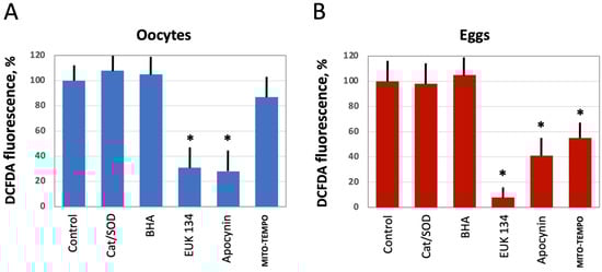 Next, we investigated the effect of several selective antioxidants targeting extracellular and intracellular ROS produced by different ROS-generating mechanisms, as detailed in Figure 1. Defolliculated Xenopus oocytes and naturally ovulated dejellied eggs were treated with the specified AOXs and loaded with DCFDA, then the indicator-specific fluorescent signal was detected. Markedly, extracellular, i.e., cell-impermeable AOXs, such as catalase (Cat) and superoxide dismutase (SOD), had no effect on intracellular levels of ROS. Moreover, the general cell-permeable free radical scavenger BHA could not affect ROS levels in both oocytes and eggs (Figure 4A,B). However, the cell-permeable SOD/Cat mimetic EUK 134 and selective inhibitor of NADPH oxidase apocynin effectively reduced ROS levels in oocytes and eggs. On the other hand, the mitochondria targeted AOX MITO-TEMPO exerted little effect in oocytes (Figure 4A), but it significantly decreased the fluorescent signal in eggs (Figure 4B). These results indicate that the major source of intracellular ROS in Xenopus oocytes and eggs is the plasma membrane NADPH oxidase, and the mitochondrial generation contributes to the intracellular ROS content to a lesser extent.