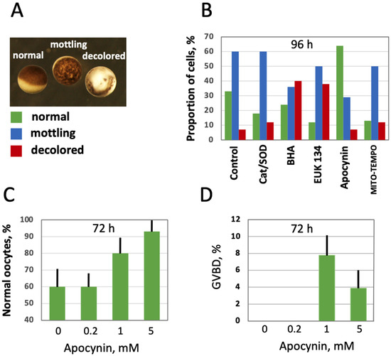 Effect of selective AOXs on the morphology of in vitro aged defolliculated Xenopus oocytes. Optical images of normal, mottling and dead oocytes are presented in panel (A), proportion of these cell phenotypes in aging oocyte populations treated with the indicated AOXs for 96 h is shown in panel (B). Panel (C) shows percentage of normal oocytes in the oocyte populations treated with the indicated concentrations of apocynin for 72 h, and panel (D) presents occurrence of germinal vesicle breakdown (GVBD) in the aged PG-treated oocytes, as estimated within 12 h of hormone administration. In panel (D), apocynin was extensively washed out for 1 h before PG addition to oocytes.