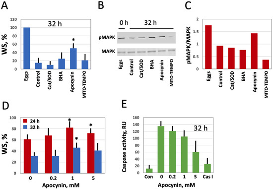 Effect of selective AOXs on the stability of in vitro aged Xenopus eggs. Defolliculated oocytes of stage VI were matured in vitro in the presence of PG, then aged on bench in the presence of the specified AOXs. The time after PG administration is indicated in the figure panels. Percentage of the aged eggs bearing a maturation marker, white spot (WS), is presented in panel (A). Panels (B,C) show the activation state of MAPK in the eggs aged in the presence of different AOXs. Proportion of WS-bearing eggs aged in the presence of the indicated apocynin concentrations for 24 and 32 h is evaluated in panel (D), and caspase activity in the eggs aged in the presence of various concentrations of apocynin is presented in panel (E). The left column in this panel (Con) refers to caspase activity in the eggs matured for 8 to 10 h, and the right column (Cas I) represents caspase activity in the negative control, as measured in the presence of a specific caspase inhibitor Z-VAD-FMK. An asterisk in panel (A) indicates statistically significant difference from the control, and asterisks in panel (D) denote statistical difference from the egg batch incubated in the absence of apocynin (p < 0.05).
