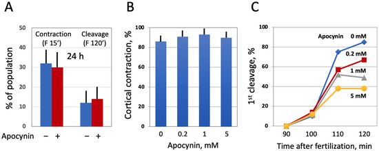 Next, we investigated the effect of modulating intracellular ROS on egg morphology and function in aging populations of eggs treated with selective AOXs. It should be noted that Xenopus eggs age in vitro much faster than oocytes [30], and the age-dependent increase in the intracellular ROS content is more prominent in the eggs than in the oocytes (Figure 3). It has been reported that the majority of naturally ovulated unfertilized frog eggs spontaneously exit meiotic metaphase arrest and degrade by a well-defined apoptotic process within 48 h of ovulation [30]. Accordingly, it was found that only about 20% of control untreated eggs were able to retain the maturation marker WS by 32 h after PG administration (Figure 6A,D). Apocynin at 1mM increased significantly the WS incidence in the aged eggs by about 50% (Figure 6A,D). Moreover, apocynin-treated eggs displayed an elevated level of MAPK phosphorylation (Figure 6B,C), suggesting that a sizeable fraction of these cells still maintained the meiotic metaphase arrest. Other AOXs tested had little effect on WS occurrence in aged eggs, and phosphorylation level of MAPK was low in the eggs incubated with these compounds (Figure 6A–C). In addition, apocynin inhibited, in a dose-dependent manner, activation of the apoptosis effector caspase, caspase 3/7, that occurs in aging unfertilized Xenopus eggs after the meiotic exit (Figure 6E). These data strongly suggested that the proportion of functionally capable fertilization-competent eggs aged in the presence of apocynin would be higher than that in the control egg population untreated with the drug. However, our experiments failed to confirm this suggestion. It was found that the fraction of eggs undergoing cortical contraction and the first embryonic cleavage after fertilization was the same in the apocynin-treated and untreated egg populations aged on a bench for 24 h (Figure 7A). Moreover, it was demonstrated that apocynin, when present during fertilization, exerted a dose-dependent inhibitory effect on furrow formation but not on the cortical contraction (Figure 7B,C). The drug did not delay timing of the first cleavage but rather decreased the proportion of eggs that bore the corresponding phenotype (Figure 7C).