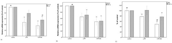 (a) Decrease in the mRNA expressions of IL-6 and IL-1β (in % of control) in LPS-stimulated RAW 264.7 cells, which were treated with unfermented PR extract and the PR extract fermented for 48 h. (b) Decrease in the mRNA expressions of iNOS and TNF-α (in % of control). (c) Decrease in NO and TNF-α levels (in % of control). Data are expressed as the mean value of at least triplicate experiments. Error bars represent +/− standard deviation. ** p < 0.01 versus control, ## p < 0.01 versus u-PR. u-PR: PR extract without fermentation; f-PR-48h: PR extract fermented for 48 h.