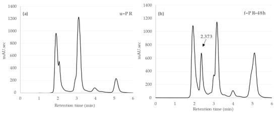 (a) HPLC chromatogram of PR extract without fermentation (u-PR) and (b) HPLC chromatogram of PR extract after 48 h fermentation (f-PR-48h). A new peak appeared at the retention time (Rt) 2.373 min, indicated by an arrow.
