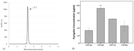 (a) HPLC chromatogram of pyrogallol. (b) Time-dependent changes in the pyrogallol concentration in PR extracts fermented for 24–96 h. The highest concentration at 92.138 µg/mL was observed in f-PR-48h. Data are expressed as the mean value of duplicate experiments. Error bars represent +/− standard deviation. ** p < 0.01 versus f-PR-24h. f-PR-24h, f-PR-48h, f-PR-72h, and f-PR-96h: PR extract after fermentation for 24, 48, 72, and 96 h, respectively.
