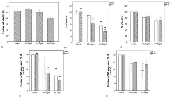 Effect of pyrogallol on LPS-induced RAW 264.7 cells. (a) Relative cell viability when RAW 264.7 cells were treated with LPS in the presence of pyrogallol at 1, 5, and 10 µg/mL. (b) Effect of pyrogallol at 1 and 5 µg/mL in intracellular ROS and NO release levels (in % of control) in LPS-stimulated RAW 264.7 cells. (c) Effect of pyrogallol at 1 and 5 µg/mL in IL-6 and TNF-α release levels (in % of control) in LPS-stimulated RAW 264.7 cells. (d) Effect of pyrogallol at 1 and 5 µg/mL in mRNA expressions of iNOS and IL-1β (in % of control) in LPS-stimulated RAW 264.7 cells. (e) Effect of pyrogallol at 1 and 5 µg/mL in mRNA expressions of IL-6 and TNF-α (in % of control) in LPS-stimulated RAW 264.7 cells. Data are expressed as the mean value of at least triplicate experiments. Error bars represent +/− standard deviation. ** p < 0.01 versus control, ## p < 0.01 versus PG-1 µg/mL. PG: pyrogallol.