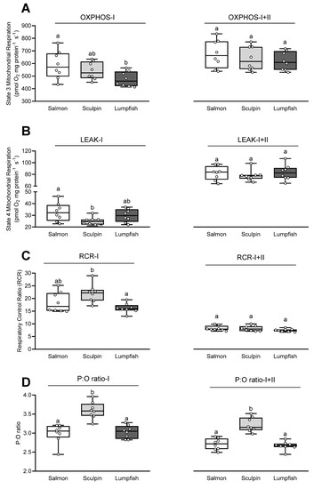 Respiration rates and respiratory control ratios (RCRs) for cardiac mitochondria of Atlantic salmon, short-horned sculpin and lumpfish. (A) Oxidative phosphorylation (OXPHOS, State 3) respiration rates and (B) LEAK respiration rates (State 4) measured with the complex-I (-I) substrates pyruvate, glutamate and malate, and the complex-I+II (-I+II) substrates pyruvate, glutamate, malate and succinate. (C) The resulting RCR (State 3/State 4 values) and (D) estimated P:O ratio ([ADPinjected]/[Oconsumed]). Values without a letter in common are significantly (p < 0.05) different; one-way ANOVAs followed by Tukey’s HSD multiple comparison tests. Values are displayed in box-and-whisker-plots; the horizontal line in each box indicates the median value, whereas the top and bottom of the box represent the 25th and 75th percentiles respectively, and the whiskers indicate the highest and lowest values recorded. Symbols represent individual values (n = 8 per group).