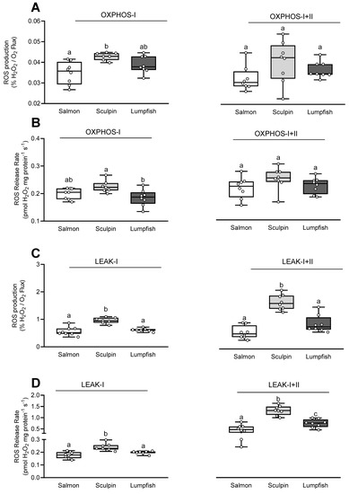 Reactive oxygen species (ROS) production for cardiac mitochondria of Atlantic salmon, short-horned sculpin and lumpfish. The ROS production/release rate during (A,B) oxidative phosphorylation (OXPHOS) and (C,D) LEAK respiration with CI and CI+II substrates, and expressed either as a percentage of mitochondrial O2 consumption (% H2O2 flux/O2 flux) (A,C) or as pmol H2O2 mg protein−1 s−1 (B,D). Other details are as in Figure 1 (n = 7–8 per group). Values without a letter in common are significantly (p < 0.05) different.