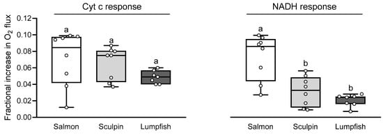 The fractional increase in OXPHOS-I+II respiration of Atlantic salmon, short-horned sculpin and lumpfish cardiac mitochondria following the addition of cytochrome c (Cyt c) and NADH. An increase in O2 flux above 0.1 (10%) would suggest a loss of membrane integrity. Other details are as in Figure 1 (n = 7–8 per group). Values without a letter in common are significantly (p < 0.05) different.