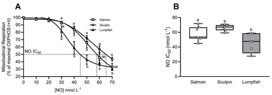 The release of NO in the chamber gradually inhibited mitochondrial OXPHOS-I+II respiration in all species (Figure 4A). Cardiac mitochondrial OXPHOS-I+II respiration in lumpfish was the most sensitive to inhibition by NO (Figure 4A,B). The NO IC50 value (44.3 ± 4.6 nmol L−1) for this species was ~35% lower as compared to that measured in salmon (57.9 ± 3.6 nmol L−1) and sculpin (66.16 ± 1.5 nmol L−1) at the same O2 level (100–115 µmol L−1 O2) (Figure 4B).