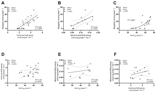 Linear pairwise regressions were used to examine the relationships between a number of the measured parameters of the NOS/NO system (NOS activity, NO IC50) and Mb content. We found a positive relationship between Mb level in the heart and NOS activity measured in ventricular homogenates and mitochondrial suspensions (R2 = 0.59, p < 0.0001 and R2 = 0.43, p = 0.028, respectively; Figure 5A,B). A positive relationship was also found between Mb and mitochondrial NO IC50 when fitting the data with a non-linear regression (R2 = 0.47; Figure 5C). In contrast, there was only a weak relationship between the mitochondrial NO IC50 and NOS activity measured in the ventricle homogenates (R2 = 0.15, p = 0.0781; Figure 5D). Furthermore, NOS activity measured in the mitochondrial suspensions did not correlate with either the mitochondrial NO IC50 or with ventricular NOS activity (R2 = 0.048, p = 0.54 and R2 = 0.10, p = 0.28, respectively; Figure 5E,F). Interestingly, we also found a negative relationship between CS activity (an indicator of the aerobic metabolism) and RVM and the mitochondrial P:O ratio (R2 = 0.3540, p = 0.022 and R2 = 0.37, p = 0.0017, respectively; Supplementary Figure S3).