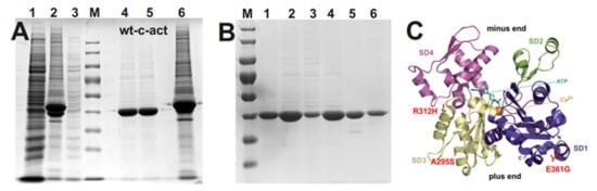 Expression of the c-α-actins (wt plus the mutants) was achieved in Sf21 insect cells by using the Baculovirus system and purified after affinity binding to gelsolin-G4-6 as reported previously [,] as shown for wt c-actin in Figure 1. The isolated c-actin variants showed only one main band after SDS-PAGE (Figure 1B) and were previously shown to be cardiac α-actin by immunoblotting using an anti-cardiac α-actin antibody [,]. Cardiac actin was also conventionally purified from acetone powder obtained from bovine hearts. After SDS-PAGE its migration behavior and reactivity in Western blots against anti-cardiac α-actin mAB were found identical to recombinant wt c-α-actin [,]. The localization of the mutated residues is indicated in the 3D model of actin (Figure 1C).