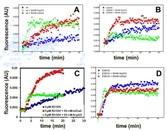 Polymerization of the purified c-actins in the presence of nucleators. (A–D) Influence of nucleators on the rates of polymerization of c-actins. (A) Recombinant wt-c-actin, (B) p.A295S, (C) p.R312H, and (D) p.E361G. All c-actins at 5 µM and in the absence of presence of either 50 nM Arp2/3 complex or 50 nM mDia3-FH2 (for details, see text). Representative experiments from three for every c-actin variant.