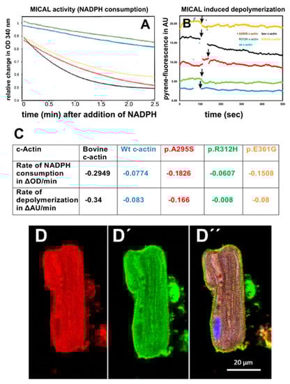 Influence of the monooxidase MICAL-1 on cardiac actin variants. (A) Rates of oxidation of c-actin variants by MICAL-1 as measured by substrate NADPH consumption determined optically at 340 nm (for details, see text). Cardiac actins at 1 µM were with 0.5 µg of the N-terminal domain of MICAL-1 in 5 mM HEPES buffer, pH 7.4, supplemented with 2 mM MgCl2 and 20 µM NADPH. Bovine c-actin (__); wt recombinant c-actin (__); p.A295S (__); p.R312H) (__); p.E361G (__). (B) Oxidation of the F-c-actin variants by MICAL-1 induced their de-polymerization. Representative experiments from three for every c-actin variant. (C) Table of the rates determined for the oxidation of the c-actins (A) and their de-polymerization (B). (D) Double immunostaining of ARCs with a mouse anti-MICA-L1 antibody and (D’) with a rabbit anti-actin antibody. (D”) Merged image together with nuclear Hoechst 33342 staining. Bar corresponds to 20 µm.