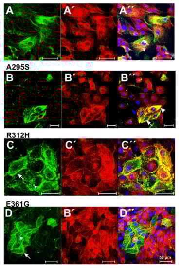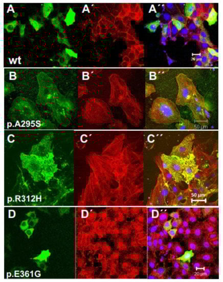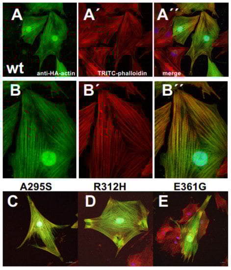 The physiological or cell biological effects of these cardiac actin variants were tested by transfection experiments into established cell lines like Hela and MDCK cells. First, we transfected Hela cells with N-terminally EGFP-tagged c-actins (Figure 4). After 24 h, the cells were fixed, counterstained with TRITC-phalloidin and Hoechst 33342 [], and examined by confocal microscopy in order to identify the localization of the c-actin variants in relation to the microfilament system. The data indicated that wt c-actin and the p.A295S (Figure 4A,B) and partly also the p.R312H mutant (Figure 4C) integrated into the stress fibers of the microfilament system. In contrast, the p.E361G mutant and also to a lesser degree the p.R312H mutant gave a more punctuate staining (Figure 4D”) either within or outside the endogenous microfilaments (p.R312H see Figure 4C”) suggesting a localization distinct from the long stress fibers.