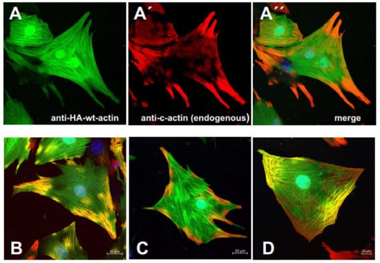 Next, we performed transduction experiments of neonatal rat cardiomyocytes (NRCs). The c-α-actin variants were found to incorporate into microfilamentous or sarcomeric structures and at least partially co-polymerized with endogenous c-actin (Figure 7 and Figure 8). A clear different intracellular localization of exogenous and endogenous c-actins was found in one to two-day-old NRCs. These cells showed a more central localization of the exogenous actins in sarcomeric and microfilamentous organizations, irrespective of the variant. In contrast, the endogenous c-α-actin was concentrated in a more peripheral microfilamentous and sarcomeric form (Figure 7A’). Sarcomerogenesis has been shown to start at the cell periphery at sites of attachment to the extracellular matrix and to subsequently extend centripetally []. These sites (also termed proto-costameres) possibly developed before translation of the adenovirally introduced exogenous c-α-actin variants and were therefore formed by endogenous c-α-actins. Therefore, the adenovirally introduced exogenous c-actins incorporated preferentially into central sarcomeric structures. However, it is also possible that the mRNA of endogenous c-α-actin contained additional localization signals that directed its translation to the cell periphery that are absent in the adenoviral constructs [].