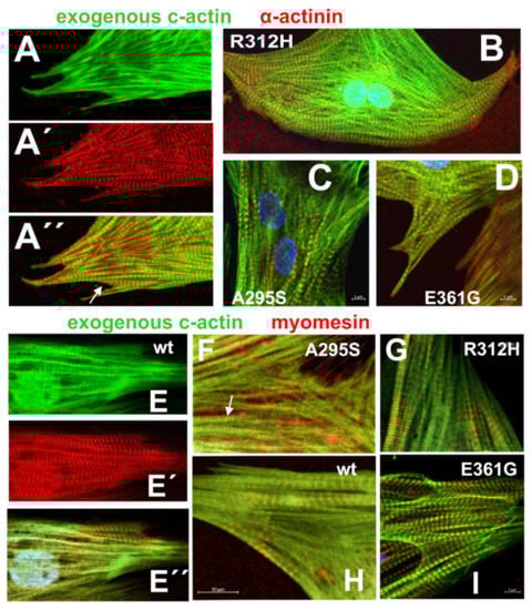 Finally, transduced NRCs were counterstained with anti-α-actinin or -myomesin to identify the site of incorporation of the exogenous c-α-actins. Three days after isolation, the NRCs had formed intracellular sarcomeric structures, which in some instances spanned the whole cytoplasm. Immunostaining with anti-α-actinin (Figure 8A–D) or anti-myomesin (Figure 8E–I) identified the Z- or M-lines, to which the thin filaments are attached by their plus ends or mark the minus ends, respectively. The data obtained showed that only the p.E361G actin was preferentially incorporated at the minus ends (co-localization with anti-myomesin staining in Figure 8I), whereas wt, p.A295S, and p.R312H appeared to incorporate preferentially at the plus ends, i.e., at the region of thZ-lines (co-localization with anti-α-actinin staining in Figure 8A’,B,C). The preferential incorporation of the p.E361G actin at the minus end might be due to the fact that the mutated site is within the binding region of α-actinin, a Z-line component. These data suggest that in case of a high expression level of the p.E361G DCM mutant, the thin filament attachment to Z-line might be impaired, leading to reduced stability of the sarcomeres.