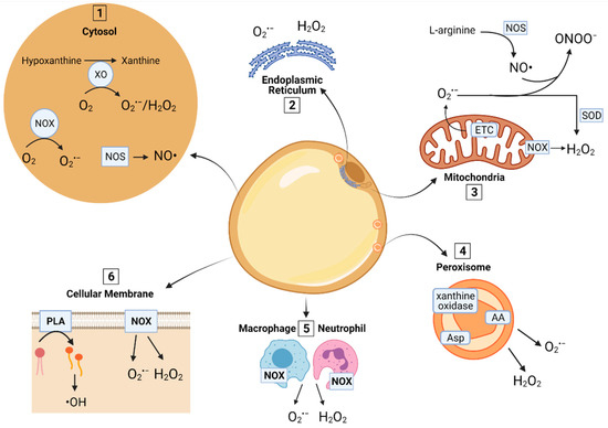 ROS is a family of free radicals, including superoxide anion (O2•−), hydrogen peroxide (H2O2), and hydroxyl radical (•OH). Nitrogen-containing species, referred to as RNS, include nitric oxide (NO•) and its derivatives peroxynitrite (ONOO−), nitrous anhydride, and nitrogen dioxide (NO2•) [4]. All cellular components of AT, including adipocytes, fibroblasts, endothelial cells, and adipocyte progenitors, are sources of free radicals. Within each AT cell, these sources include the mitochondria, cytosol, endoplasmic reticulum, peroxisomes, plasma membrane, and phagosomes (Figure 1; for a detailed review, readers are referred to [5]).
