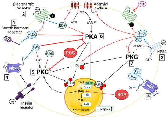 Redox signaling and lipolysis. ROS and RNS alter lipolytic pathways at different points. (1) Growth hormone receptor: ROS, especially H2O2, production increases upon growth hormone (GH) binding to the growth hormone receptor, consequently activating β-adrenergic receptor (βAR), adenylyl cyclase (AC), and protein kinases downstream, increasing lipolysis. (2) β-adrenergic receptor: Adrenalin (Adr) binds to βAR and increases the production of ROS. O2•− and H2O2 also oxidize βAR, increasing adipocyte sensitivity to lipolysis. On the other hand, NO• suppresses βAR activation. (3) Natriuretic peptide receptor: O2•− and H2O2 produced upon activation of NPRA enhance the activation of βAR, AC, and cAMP synthesis, increasing lipolysis. (4) Nicotinamide adenine dinucleotide phosphate oxidase: NOX converts O2 to O2•− and H2O2. Moreover, insulin, through the production H2O2 by NOX4, inhibits PKA activation, reducing adrenergic stimulated lipolysis. (5) Protein kinase C (PKC): at high concentration, O2•− and H2O2 activate PKC through the release of diacylglycerol (DAG) or may inactivate it by impairing its substrate-binding affinity. At low concentrations, ROS activate PKC by oxidizing its structural cysteine residues. H2O2 activates PKC by increasing Ca2+ concentrations. (6) Protein kinase A (PKA): at high concentration, ROS inhibit cAMP-dependent PKA, but at low concentration, ROS prolong the activation of PKA by inhibiting the phosphatase that suppresses it. (7) Protein kinase G (PKG): it is currently unknown how ROS affect PKG activity in adipocytes. Black arrows represent the classic lipolytic pathway, blue arrows represent the production of ROS/RNS, and red arrows represent the effect (activation or inhibition) of ROS/RNS.