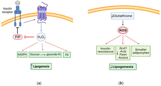 Redox signaling and lipogenesis. (a) H2O2 acts as a secondary messenger of insulin in adipocytes by suppressing the oxidation of protein tyrosine phosphatases (PIP), thus facilitating insulin signaling. H2O2 also increases lipogenesis by increasing NADPH and glucose incorporation into glyceride-FA, and stimulating pyruvate dehydrogenase (PD); (b) enhanced Fat ROS, through the depletion of glutathione in adipocytes, decreases insulin sensitivity, reduces lipogenic gene expression, and display smaller adipocytes.