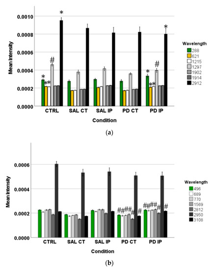 The intensity of the peaks responsible for the separation of the different groups of unlabeled samples found by OPLS-DA was measured in the corresponding Raman spectra. The graphs represent their mean intensity ± SEM from the spectra acquired in the interval from 0 to 3800 cm−1. (a) Values for the unique peaks appearing in the comparison between control (CTRL) and the ipsilateral hemisphere of the 6-OHDA-lesioned mice (PD IP). (b) Values for the unique peaks appearing in the comparison between both hemispheres of the 6-OHDA-lesioned mice (PD CT and PD IP). (c) Values for the unique peaks appearing in the comparison between control (CTRL) and the ipsilateral hemisphere of the saline mice (SAL IP). One-way ANOVA or Welch’s ANOVA followed by Bonferroni or Games-Howell post hoc test, respectively, was performed, with * p < 0.05 and # p < 0.001. The sampling distribution was first tested for normality using the Shapiro-Wilk test and for homogeneity of variances using the Levene’s test.