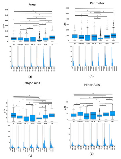 For the minor axis feature, the highest mean value was displayed by the microglia cells that grew in 2D with the LPS stimulus (LPS). No differences were found between the cells that grew on the control matrices (CTRL) and those seeded on the ipsilateral region of the 6-OHDA-lesioned mice (PD IP). Moreover, no differences were found between the ipsilateral hemispheres of the saline and 6-OHDA-lesioned mice (SAL IP and PD IP).