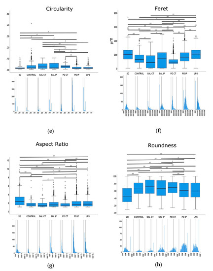 Images were acquired with a widefield microscope (Axiovert 200M, Carl Zeiss AG, Oberkochen, Germany) using a 40× LD Plan-Neofluar oil immersion objective 0.6 N.A., and appropriate filters for DAPI and Alexa Fluor® 647. To quantify the morphological features of the microglia, images were processed using ImageJ [40,41] and Ilastik [42] software. Briefly, the rolling ball algorithm was first applied with a radius of 80 pixels to fix the uneven background. The resulting images were then segmented within Ilastik, an interactive machine learning framework for pixel segmentation. A second stage for segmentation refinement was then performed in ImageJ to split touching cells (by manually deleting a line with two pixels width) or to merge processes incorrectly separated from the corresponding cell bodies. For each resulting image/mask pair, measurements of area (µm2), perimeter (µm), major and minor axes, roundness, Feret’s diameter (µm), aspect ratio, solidity, and circularity were made. The definition of each feature is defined as the total number of pixels present in an object. The feature perimeter is defined as the length of the outer boundary of the cell. The major axis is defined as the longest line that can be drawn through the cell, while the minor axis is the longest line that can be drawn through the cell while remaining perpendicular to the major axis. The shape descriptor circularity is calculated using the following formulae: