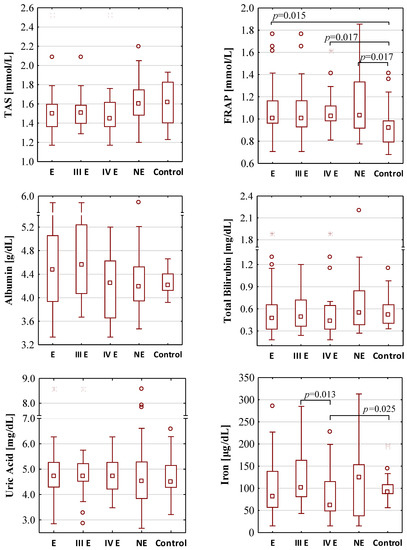 No significant differences were found in the concentrations of serum albumin, total bilirubin, uric acid and iron between the endometriosis (median values: 4.48 g/dL, 0.47 mg/dL, 4.72 mg/dL and 82.00 μg/dL, respectively), non-endometriosis (median values: 4.18 g/dL, 0.54 mg/dL, 4.53 mg/dL, and 124.00 μg/dL, respectively) and control (median values: 4.22 g/dL, 0.52 mg/dL, 4.50 mg/dL and 91.00 μg/dL, respectively) groups. Between stages III and IV of endometriosis, significant differences in concentrations of iron were observed (median values: 101.50 μg/dL and 62.00 μg/dL, p = 0.013); additionally, the concentrations of iron were significantly lower (p = 0.025) in sera of patients in IV stage of endometriosis than in the control group.
