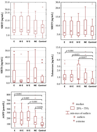 The serum concentrations of SIRT3, SIRT5 and SIRT6 were similar in the endometriosis (median values: 8.53 ng/mL, 5.96 ng/mL and 2.94 ng/mL, respectively), non-endometriosis (median values: 7.85 ng/mL, 7.30 ng/mL and 7.38 ng/mL, respectively) and control group (median values: 10.28 ng/mL, 6.80 ng/mL and 2.20 ng/mL, respectively). These parameters were also on a comparable level in stage III (median values: 8.85 ng/mL, 6.89 ng/mL and 2.66 ng/mL, respectively) and stage IV (median values: 8.34 ng/mL, 5.83 ng/mL and 6.64 ng/mL, respectively) of endometriosis. The telomerase concentration was significantly higher in the endometriosis group (median value: 0.86 ng/mL) than in the control group (median value: 0.15 ng/mL, p = 0.004). Significantly higher telomerase concentrations were also observed in the serum samples of patients with moderate (median value: 1.01 ng/mL, p = 0.021) and severe (median value: 0.75 ng/mL, p = 0.017) endometriosis group in comparison to the healthy women from the control group.