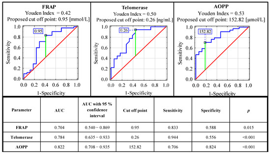ROC curve analysis carried out for concentrations of serum oxidative-antioxidant balance parameters in the endometriosis and the control group identified parameters with significant clinical value. From all the analyzed parameters, only FRAP, telomerase and AOPP could be considered as markers useful in endometriosis diagnostics. The sensitivity and specificity of these parameters were, respectively: 0.833, 0.588 (AUC 0.704—moderate clinical value); 0.944, 0.556 (AUC 0.784—moderate clinical value); and 0.706, 0.824 (AUC 0.822—moderate clinical value). For the determination of cut-off points, the Youden index method was used (Figure 2). The clinical value of a laboratory test with AUC can be defined as: 0–0.5—zero, 0.5–0.7—limited, 0.7–0.9—moderate and >0.9 high [35].