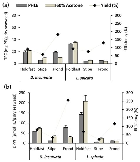 Effectivity of PHLE against 60% acetone in the extraction of phlorotannins from the main anatomical parts of D. incurvata and L. spicata: holdfast, stipe, and frond. (a) The TPC (mg PE/g dry seaweed) and (b) the antioxidant capacity, measured as DPPH RSA (μmol TE/g dry seaweed), were analyzed in PHLE and 60% acetone extracts obtained from a randomly selected sample per each species/thallus part combination. PHLE-TPC and PHLE-AC efficiencies were determined as a ratio of the 60% acetone extracts’ values. Bars represent the means ± SD of three extractions carried out per each sample and method, and dots correspond to the mean efficiencies of PHLE.