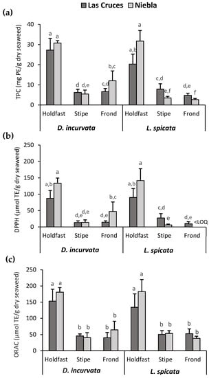 Spatial, anatomical, and interspecies variability of the phlorotannin content and antioxidant capacity of the seaweeds D. incurvata and L. spicata harvested in central (Las Cruces) and southern (Niebla) Chile. (a) The TPC (mg PE/g dry seaweed) and (b,c) the antioxidant capacity, quantified by DPPH RSA and ORAC (μmol TE/g dry seaweed), were determined in the PHLE extract. Bars represent the means ± SD of five replicates. Means were compared using one-way ANOVA and Tukey post hoc tests (α ≤ 0.05). Different letters indicate significantly different groups for each response. <LOQ: below the limit of quantification.