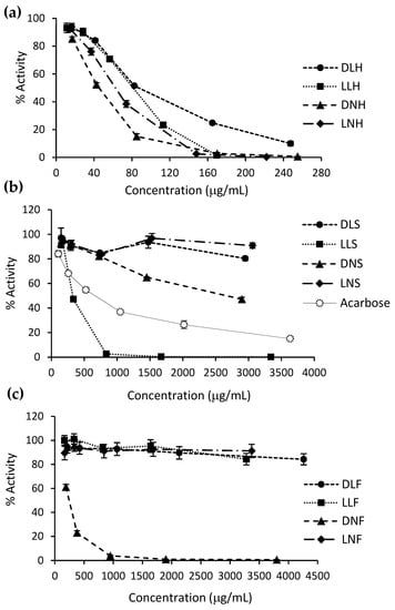 For α-glucosidase, all holdfast extracts (Figure 3a) and three extracts from fronds and stipes (Figure 3b,c) displayed an inhibitory activity above 50% in the assayed ranges. LNH, LLH, and DNH extracts almost completely inhibited the enzyme from around 160 μg/mL, whereas LLS and DNF inhibited the enzyme from about 1000 μg/mL. As seen in Table 4, and according to the one-way ANOVA and Tukey post hoc tests (Tables S4 and S5), the DNH extract presented the highest α-glucosidase inhibitory capacity, with an IC50 value of 45.2 ± 1.6 μg/mL, i.e., around fifteen-fold lower than that of acarbose (659.5 ± 36.7 μg/mL). Except for DNS, the other active extracts showed IC50 values far lower than acarbose, ranging from 62.6 ± 2.4 to 324.1 ± 6.5 μg/mL. These inhibition results positively correlate with the TPC, DPPH RSA, and ORAC values of the extracts, showing correlation coefficients of 0.90, 0.93, and 0.87, respectively (not statistically different). It seems that holdfast polyphenols are more bioactive than stipe and frond polyphenols since the differences between holdfast and stipe/frond extracts are more significant in glucosidase inhibition activity than in TPC and AC.