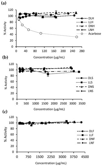 Prior to the analysis, sample dilutions (10–4500 μg/mL), starch solution (0.5% w/v), and porcine pancreatic α-amylase (0.5 mg/mL) were prepared in 20 mM phosphate buffer pH 6.9 (with 6 mM sodium chloride). Then, equal volumes (100 μL) of each sample dilution and 0.5% starch were mixed and incubated at 25 °C for 10 min in a water bath. An aliquot of 100 μL of 0.5 mg/mL α-amylase was added to the mixtures and incubated again at 25 °C for 10 min. The reactions were stopped by adding 200 μL of dinitrosalicylic acid color reagent and incubating at 100 °C for 5 min. Once room temperature was reached, 50 μL of the samples were transferred to a 96-well microplate and diluted with 200 μL of deionized water. The absorbances were read at 540 nm (Gemini XPS, Molecular Devices, San Jose, CA, USA). The commercial antidiabetic drug acarbose was also assayed as the positive control. Enzyme activities (%) were calculated using equation 2.