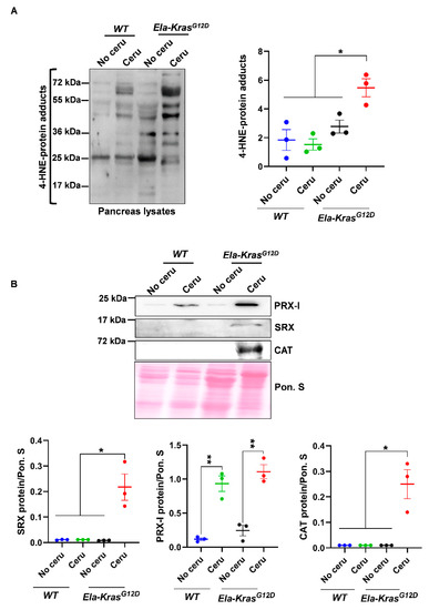 To investigate the main pancreatitis-driven redox changes occurring in the presence of either wild-type Kras or mutated KrasG12D alleles, WT and Ela-KrasG12D mice were challenged with cerulein for 5 days to induce pancreatitis (inflammation of the pancreas). We first measured the oxidative damage marker 4-HNE. Interestingly, in total pancreas lysates, we found increased 4-HNE levels only in cerulein-treated Ela-KrasG12D, but not cerulein-treated WT mice (Figure 1A); this increase was also observed in the plasma of cerulein-treated Ela-KrasG12D mice compared to their untreated siblings (Figure S1A), indicating that pancreatitis induces both local and systemic oxidative damages, selectively in Ela-KrasG12D mice. It is well-known that pancreatitis induces redox unbalance in WT rodents [9,10,11]. The absence of a significant increase in 4-HNE in our cerulein-treated WT mouse model is not synonymous with the absence of redox alterations; it probably means that a longer period and/or higher doses of cerulein treatment are needed to induce significant oxidative damage level. However, our data undoubtedly show that the oncogenic KrasG12D increases the extent of oxidative damages and accelerates the establishment of a pro-oxidant state in the pancreas. Since acinar cells are mainly affected by pancreatitis, we wanted to confirm that the redox changes observed in the total pancreas are also occurring in acinar cells. To do so, we used an ex vivo culture system that mimics the effect of pancreatitis on acinar cells. On day 3 (metaplastic acini), ROS levels were increased three-fold compared to day 1 (non-metaplastic acini) in acinar cultures from Ela-KrasG12D pancreata (Figure S1B), indicating the presence of a pro-oxidant response in the whole pancreas and in acinar cells during pancreatic transformation.