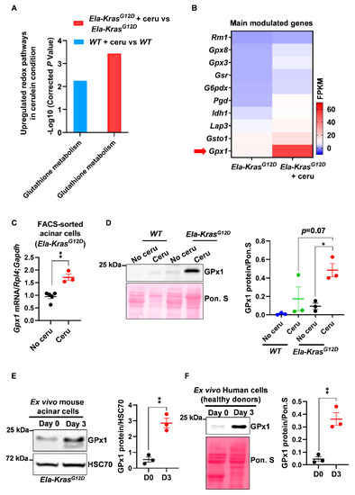 Among other genes, we observed that the expression of glutathione peroxidase (Gpx1) was mostly increased at the mRNA level in FACS-sorted acinar cells from cerulein-treated Ela-KrasG12D mice compared to untreated counterparts (Figure 2B,C); glutathione peroxidase (GPx1) plays a critical role in the consumption of intracellular glutathione to buffer pro-oxidative responses. This result was also reproduced at the protein level in total pancreas lysates from cerulein-treated Ela-KrasG12D mice and in specific acinar cultures from the same genetic background (Figure 2D,E). Interestingly, the expression of GPx1 was higher in Ela-KrasG12D mice compared to their WT counterparts (Figure 2D), thus confirming the higher extent of redox changes occurring in the presence of KrasG12D mutation. We also observed an increased protein expression of GPx1 in primary human pancreatic cells cultured ex vivo under conditions mimicking inflammation (Figure 2F). As a proof of glutathione metabolism activation, we observed that short-term pancreatitis (1 day of treatment) decreased reduced glutathione (GSH) levels and increased the production of glutathione disulfide (GSSG) in the pancreas of cerulein-treated mice compared to healthy siblings (No cerulein) (Figure S3), highlighting the use of reduced glutathione (GSH) by GPx1 to buffer the pro-oxidant environment induced by pancreatitis [30]. These experiments validate the increase in GPx1 expression at the mRNA and protein levels and suggest that changes in glutathione utilization rates occur during pancreatitis. These experiments also reveal that a similar mechanism may also operate in inflamed human pancreata.