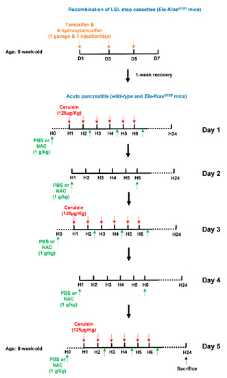 Illustration of the tamoxifen and cerulein regimens as well as NAC treatments. To initiate pancreas tumorigenesis, 6-week-old Ela-KrasG12D mice were first treated once a day with tamoxifen (gavage) and 4-hydroxytamoxifen (subcutaneous injection), on day (D) 1, 3 and 5 (orange arrows), to induce recombination of the LSL stop cassette and allow the expression of KrasG12D from its endogenous locus. After tamoxifen injections, mice recovered for 1 week. To induce acute pancreatitis, wild-type (WT) or tamoxifen-treated Ela-KrasG12D mice started a 5-day acute pancreatitis regimen. On day (D) 1, 3 and 5, mice received 6-daily intraperitoneal cerulein injections (red arrows) at a frequency of 1 injection/h (H). Cerulein diluted in a PBS volume of 100-150 µL was injected at a concentration of 125 µg/kg/injection. On day (D) 1, 3 and 5, mice received 4 intraperitoneal injections of NAC as indicated (green arrows). On day (D) 2 and 4, mice received 2 intraperitoneal injections of NAC as indicated (green arrows). Each NAC dose was 1 g/kg in a volume of 100–150 µL diluted in PBS. For vehicle-treated mice, intraperitoneal injections of 100–150 µL PBS were given instead of NAC. Mice were then sacrificed by cervical dislocation after 24 h.