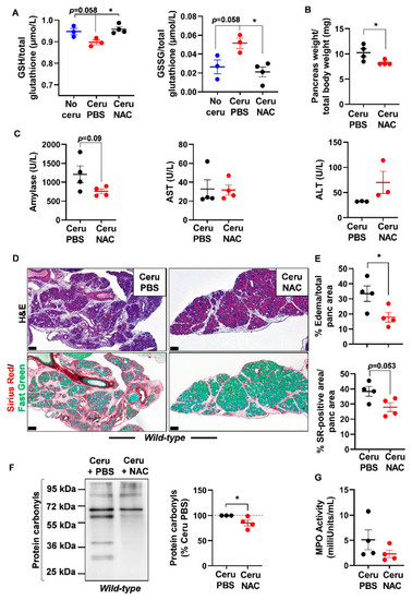 N-acetylcysteine treatment improves acute pancreatitis hallmarks in wild-type mice. (A) Reduced glutathione (GSH) and glutathione disulfide (GSSG) measurements in pancreas lysates of wild-type (WT) mice treated with cerulein and PBS for 5 days (Ceru PBS; n = 3), cerulein and NAC for 5 days (Ceru NAC; n = 4) or untreated (No ceru; n = 3). (B) Pancreas weight normalized to total body weight in wild-type (WT) mice treated with cerulein and PBS for 5 days (Ceru PBS; n = 4) or cerulein and NAC for 5 days (Ceru NAC; n = 4). (C) Measurement of plasma amylase, aspartate transaminase (AST) and alanine transaminase (ALT) levels in wild-type (WT) mice treated with cerulein and PBS for 5 days (Ceru PBS; n = 3–4) or cerulein and NAC for 5 days (Ceru NAC; n = 3–4). (D) Hematoxylin and eosin (H&E) staining and Sirius Red (SR) staining on the pancreata of wild-type (WT) mice treated with cerulein and PBS for 5 days (Ceru PBS; n = 4), or cerulein and NAC for 5 days (Ceru NAC; n = 4). Bars: 100 µm. (E) Whole-tissue quantifications for edema and SR-positive areas from panel D. (F) Western blot for the oxidative damage marker, protein carbonyls, on pancreas lysates of wild-type (WT) mice treated with cerulein and PBS for 5 days (Ceru PBS; n = 3) or cerulein and NAC for 5 days (Ceru NAC; n = 4). (G) Myeloperoxidase (MPO) activity on pancreas lysates of wild-type (WT) mice treated with cerulein and PBS for 5 days (Ceru PBS; n = 4) or cerulein and NAC for 5 days (Ceru NAC; n = 4). Data are mean ± SEM. Statistical significance for Panel A was tested by one-way ANOVA test and further interactions were analyzed by post hoc test (* p < 0.05). Statistical significance for panels B–G was tested by Student’s t-test (* p <0.05). Dixon’s Q test was applied to remove outlier samples, before conducting statistical analysis. A statistical tendency was considered when p-values were 0.05 < p < 0.1. All quantifications in this figure show biological replicates.