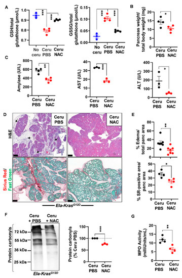 Emerging studies confirm the importance of reactive oxygen species (ROS) in PDAC pathophysiology [7,8]. Yet, the precise redox changes driven by pancreatitis during PDAC initiation are still not clearly elucidated. Indeed, multiple studies have characterized the redox alterations occurring during inflammation-induced metabolic dysfunction and pancreatitis in wild-type rodents [9,10,11,12,13,14,15,16]; however, there is a lack of information regarding the main redox changes taking place during the initiation of pancreas tumorigenesis (presence of Kras mutations). To fill this gap of knowledge in the field, we herein compared mice expressing Kras wild-type alleles (control mice) with those expressing acinar-specific mutated KrasG12D oncogenic allele. We found that pancreatitis induced greater redox unbalance and oxidative damages during pancreas tumorigenesis in mice bearing KrasG12D mutation. Strikingly, KrasG12D mice were more responsive to supplementation with the thiol-rich compound, N-acetylcysteine (NAC), as evidenced by a reduction in inflammation severity and systemic and pancreatic oxidative damages. Therefore, using this comparative approach, our study demonstrates that KrasG12D mutation aggravates redox unbalance in the presence of pancreatitis. It also provides a rationale to use thiol-containing compounds as an adjuvant therapy, not only for pancreatitis, but also in the context of pancreatic tumorigenesis.