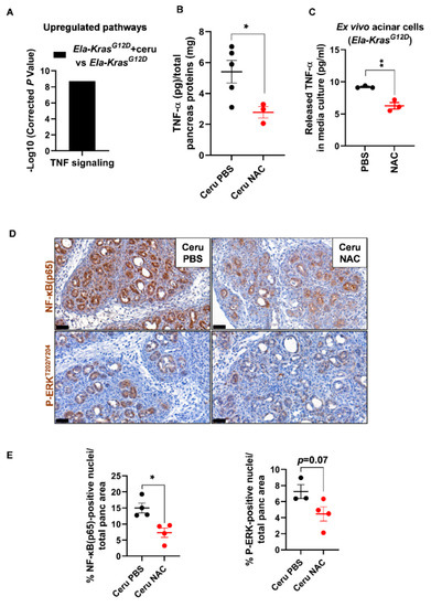 Since Ela-KrasG12D mice exhibited a higher responsiveness to NAC treatment, we focused on this genetic background to better understand the impact of NAC on pancreatic inflammation during pancreatitis. We returned to the transcriptomic data of FACS-sorted acinar cells from cerulein-treated and untreated Ela-KrasG12D mice and found an important upregulation of TNF signaling in response to pancreatitis (Figure 6A). Since TNF-α plays a key role in the formation of edema in the lungs [39,40,41], we assume that it can exert similar functions in the pancreas. To test our hypothesis, using ELISA, we measured the TNF-α content in pancreas lysates from cerulein-treated Ela-KrasG12D mice supplemented with PBS or NAC. Interestingly, in the pancreas, edema levels correlated positively with TNF-α levels (Pearson, r = 0.93, p < 0.05) and NAC treatment reduced TNF-α rates in the pancreata of Ela-KrasG12D mice compared to vehicle-treated counterparts (Figure 6B). Acinar cells actively produce pro-inflammatory cytokines during pancreatitis and pancreas tumorigenesis [21,42]. To check the impact of NAC on acinar-specific TNF-α release, we isolated acinar cells from Ela-KrasG12D pancreata and cultured them ex vivo under conditions mimicking inflammation. Strikingly, NAC-treated acinar cells released two-fold less TNF-α in culture media compared to vehicle-treated ones (Figure 6C). Accordingly, the nuclear translocation of NF-κB(p65), a transcription factor involved in the regulation of cytokines expression [43], was also decreased by two-fold in acinar cells from NAC-treated Ela-KrasG12D pancreata (Figure 6D,E). In favor of a transcriptional control for TNF-α expression and release, we found that NAC treatment significantly reduced TNF-α mRNA expression in ex vivo cultured acinar cells from Ela-KrasG12D pancreata (Figure S7); the expression of other pro-oxidant and inflammatory genes, including IL6, Ccl2 and Nos2, was downregulated in NAC-treated acinar cells compared to vehicle-treated cultures (Figure S7). Finally, the activation of ERK-MAPK, a critical pathway for pancreas carcinogenesis and inflammation, tended to decrease in acinar cells following NAC administration into Ela-KrasG12D mice (Figure 6D,E). However, we cannot rule out that NAC may also reduce the production of TNF-α from immune cells infiltrating the pancreas. Our results indicate that NAC reduces the severity of inflammation during the initiation of pancreas tumorigenesis, at least partly, by decreasing the production of TNF-α from acinar cells.