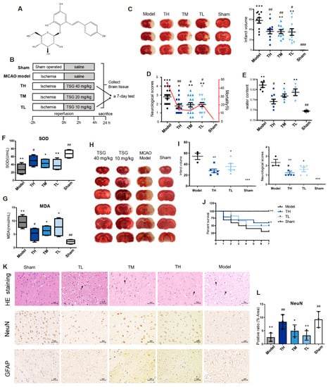Protection of TSG on cerebral I/R injury in the MCAO rats. (A) The structure of TSG. (B) Experimental procedure of testing 24 h/7 day TSG efficacy effects in the MCAO rats. (C) TTC staining of cerebral slices and cerebral infarct volume (% of hemisphere), n = 10. (D,E) Neurobehavioral scores, mortality of rats and brain water content (n = 6). (F,G) Boxplots of biological parameters SOD, MDA (n = 4). (H,I) TTC staining of cerebral slices, infarct volume and neurobehavioral scores of MCAO rats after a 7 day TSG treatment. (J) Kaplan–Meier survival curve of rats in 7 days. (K,L) HE staining, immunohistochemistry of NeuN and GFAP of brain sections. Positive ratio (% of area) of NeuN immunostaining (n = 3). Black arrows indicated perineuronal vacuolization of the infarcted cortex region. Scale bar represents 50 µm. # p < 0.05, ## p < 0.01 and ### p < 0.001, other groups vs. model group; * p < 0.05, ** p < 0.01 and *** p < 0.001, other groups vs. sham group.