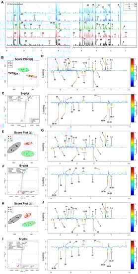 A supervised orthogonal signal correction partial least squares discriminant analysis (OSC-PLSDA) was performed for multivariate statistical analysis to maximize the discrimination between classes by filtering irrelevant effects [25]. Metabolic patterns between groups were shown in the score plots; differential metabolites were visualized by S-plots and loadings plots color coded with the absolute value of coefficients (Figure 2B–J). The fold-change values of metabolites and the associated p-values corrected with the Benjamini and Hochberg (HB) method [26] are listed as a colored table (Table 1).