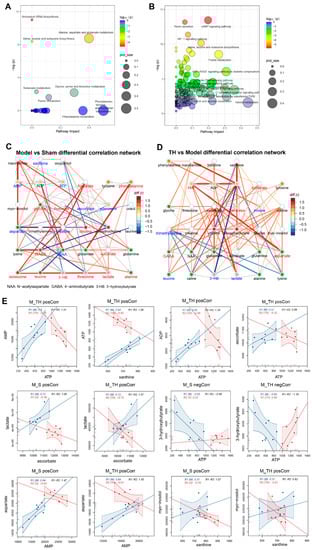 Metabolomics pathway and correlation network analysis of TSG putative targets. (A,B) Impact of pathways enriched on the disturbed metabolites and predicted targets of TSG in bubble plots. The color of each circle is based on p-values (darker colors indicate more significant changes of metabolites in the corresponding pathway), whereas the size of the circle corresponds to the pathway impact score. The most impacted pathways with high statistical significance scores are annotated. (C,D) Differential correlation network analysis of brain metabolic profiles between the sham, model and TH groups. Metabolites with Pearson’s correlations coefficients over 0.65 and p-values less than 0.05 are connected by solid lines that are color coded according to the values of the coefficients; a warm color represents a positive correlation, and a cool color represents a negative correlation. The width of each line was scaled based on its absolute values. The names of the metabolites shown in red and blue indicated that they are significantly increased and decreased, respectively. The gray lines between the metabolites indicated direct biological reactions. (E) Scatter plots of correlated metabolites. Each point represents one sample. R1 and R2 indicate the Pearson coefficient between two metabolites in each two group.