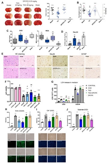 DPCPX abolished the neuroprotection of TSG in vivo and in vitro. (A) TTC staining of cerebral slices and cerebral infarct volume percentage (% of hemisphere), n ≥ 8. (B) Neurobehavioral scores and mortality of rats (n ≥ 7). (C) Boxplots of biological parameters SOD, MDA (n = 4). (D) Bar plots for the positive expression ratio of NeuN (n = 3). (E) HE staining, NeuN and GFAP immunostainings of brain sections from the model, TH, DPCPX + TH and sham groups, n = 3. Scale bar represents 50 µm. (F) Cell viability of SH-SY5Y cells with different treatment (CTSG: Control + TSG; DPCPX + TSG: 5 µM, 8 µM, respectively) after OGD/R and under normoxic condition was determined by the CCK-8 assay. (G) Cellular LDH release were determined after OGD 3 h and OGD/R with treatment of TSG (8 µM), DPCPX (5 µM), DPCPX (5 µM) + TSG (8 µM) combination. (H) Intracellular ROS in OGD/R cells was reflected by the fluorescence intensity with DCFH-DA probe (intracellular ROS assay) stained. Representative immunofluorescence images of SH-SY5Y cells are shown. Scale bar represents 100 µm. (I) Ca2+ influx was determined by immunofluorescence staining assay after OGD. Representative immunofluorescence images of SH-SY5Y cells are shown. Scale bar represents 50 µm. (J) Glutamate release in medium was determined by glutamate assay kit after OGD. The mean fluorescence intensity was calculated by Image J software. # p < 0.05, ## p < 0.01 and ### p < 0.001, other groups vs. model/OGD/R group; * p < 0.05, ** p < 0.01 and *** p < 0.001, other groups vs. sham/control group.