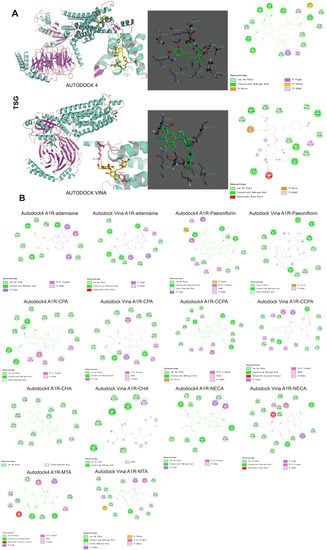 Molecular docking analyses between A1R and its agonists. (A) The output of AutoDock4 and AutoDock Vina showed the binding site residues of A1R with the ligand TSG edited in PyMOL/Discovery Studio 4.5 software. TSG (yellow stick format) was docked in the lowest energy conformation inside the binding pocket of A1R (shown in marine and violet). Detailed binding site residues (green color) of A1R protein with the ligand TSG (green stick format) and 2D diagram showed the types of contacts formed between A1R and TSG. The green dotted lines indicated H-bond interactions between A1R and TSG. (B) Two-dimensional diagrams showing the types of contacts formed between A1R and its known agonists (adenosine, paeoniflorin, CPA, CCPA, CHA, NECA and MTA) output by AutoDock4 and AutoDock Vina.