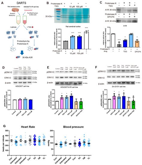 TSG targeted A1R and activated ERK1/2 phosphorylation, a downstream signal of A1R. (A) Experimental procedure of DARTS with TSG. (B) Coomassie SimplyBlue staining of the cerebral lysates subjected to proteinase K digestion (n = 3). (C) SDS-PAGE analysis of the cellular lysates subjected to proteinase K digestion with A1R antibody staining (n = 3). (D) The phosphorylation of ERK1/2 in HEK293T cells without A1R was detected by Western blot after 24 h incubation with adenosine (ADO, 8 µM) and TSG (4 µM and 8 µM). (E,F) The phosphorylation of ERK1/2 in HEK293T/A1R cells and SH-SY5Y cells was detected by Western blot after 24 h treatment of ADO (8 µM), DPCPX (5 µM) and TSG (4 µM and 8 µM). The gray value was analyzed by ImageJ software. All the values were expressed as mean ± SD, n ≥ 3. (G) The heart rate and blood pressure of rats 14 days before TSG treatment and 21 days with TSG treatment, respectively. TSG was treated for rats for 21 days with 40, 20 and 10 mg/kg (s.c., twice a day) corresponding to the TH, TM and TL groups. Each point represents the mean value of blood pressure and heart rate of rats each day in the same group. The observed vertical bar represents the mean ± SD of the blood pressure and heart rate at 14 days and 21 days, respectively. * p < 0.05, and *** p < 0.001, other groups vs. Control group.