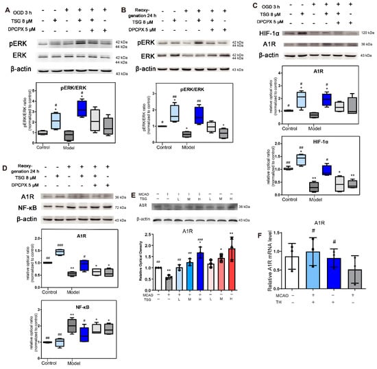Effects of TSG on the expression of HIF-1α, A1R, NF-κB, ERK1/2 and pERK1/2 in OGD cells. (A,B) The expression of ERK1/2 and pERK1/2 in SH-SY5Y cells harvested after OGD 3 h and OGD/R (3 h/24 h) and the relative intensity ratio of pERK/ERK (n = 4). (C) The expression of A1R, HIF-1α in SH-SY5Y cells harvested after OGD (n = 4). (D) The expression of A1R, NF-κB in SH-SY5Y cells harvested after OGD/R (n = 4). (E) The expression of A1R in rats of each group (n = 3). (F) The gene expression levels of A1R affected by MCAO and TSG in brains by Q-RT-PCR in each group (n = 3). The relative intensity was analyzed with ImageJ software and calculated by the ratio relative to the β-actin intensity. # p < 0.05, ## p < 0.01, and ### p < 0.001, other groups vs. the model, OGD or OGD/R groups; * p < 0.05, ** p < 0.01, other groups vs. the control group.