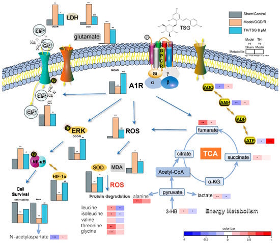 A schematic picture of TSG neuroprotection. TSG exerted its neuroprotective effect against cerebral I/R injury by activating A1R, upregulating its level, and triggering its downstream signaling pathways. TSG reversed the disturbed energy and amino acids metabolism in the brain of MCAO rats, ameliorated oxidative stress in vivo and in vitro. OGD/R induced Ca2+ overload and excessive glutamate release, decreased phosphorylation of ERK1/2 and HIF-1α stability and increased NF-κB level, which could be reversed by TSG. α-KG, α-ketoglutarate; TCA cycle, tricarboxylic acid cycle. # p < 0.05, ## p < 0.01 and ### p < 0.001, other groups vs. model/OGD/R group; * p < 0.05, ** p < 0.01 and *** p < 0.001, other groups vs. sham/control group.