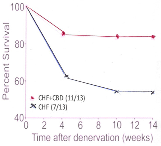 This panel shows the percent survival in CHF animals which had undergone CB denervation (CBD), compared to CHF animals which had not had their CB denervated.